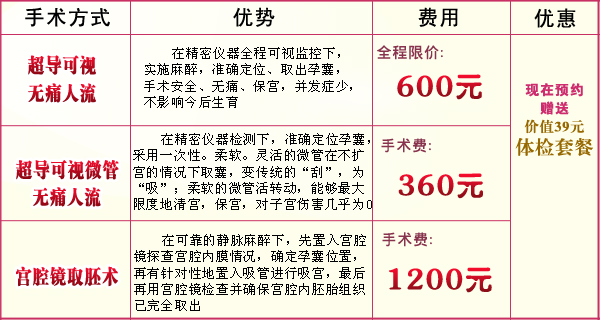 呼和浩特人流醫(yī)院的無痛人流技術包括:“超導可視無痛人流”、“超導可視微管無痛人流”、“宮腔鏡取胚術”。截至本月底,醫(yī)院針對通過網絡預約的患者實行以下優(yōu)惠價格。